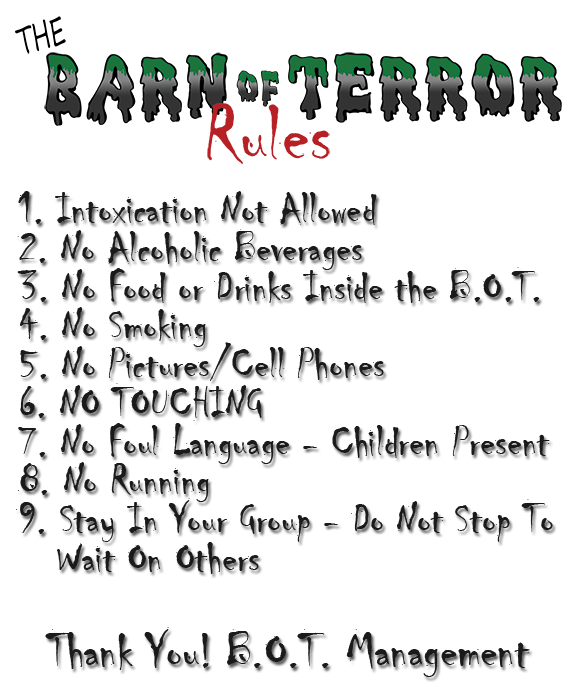 Warning: The B.O.T. features a very rough, uneven dirt floor. The haunt is not easily navigable for guests with walkers, canes, strollers, or wheelchairs.